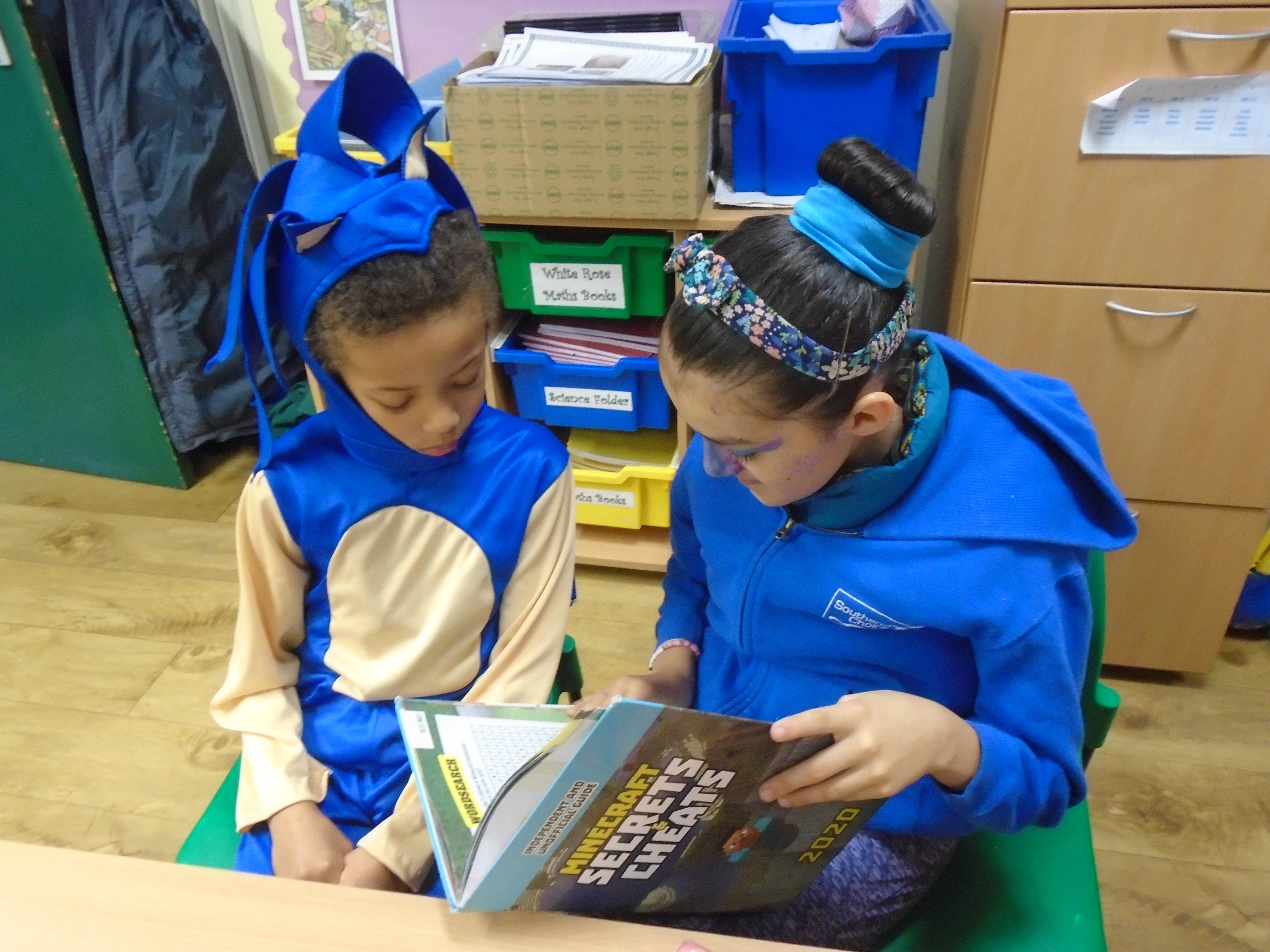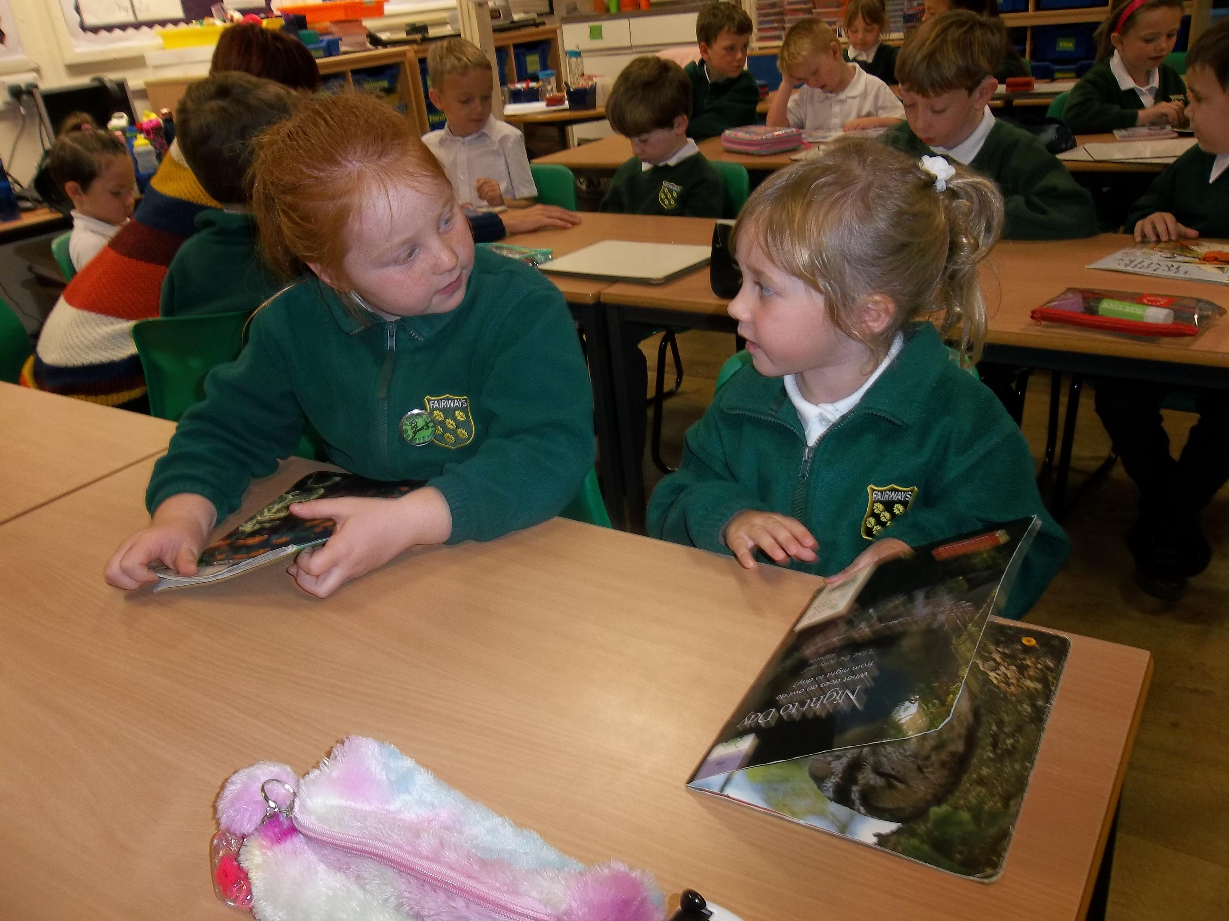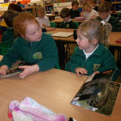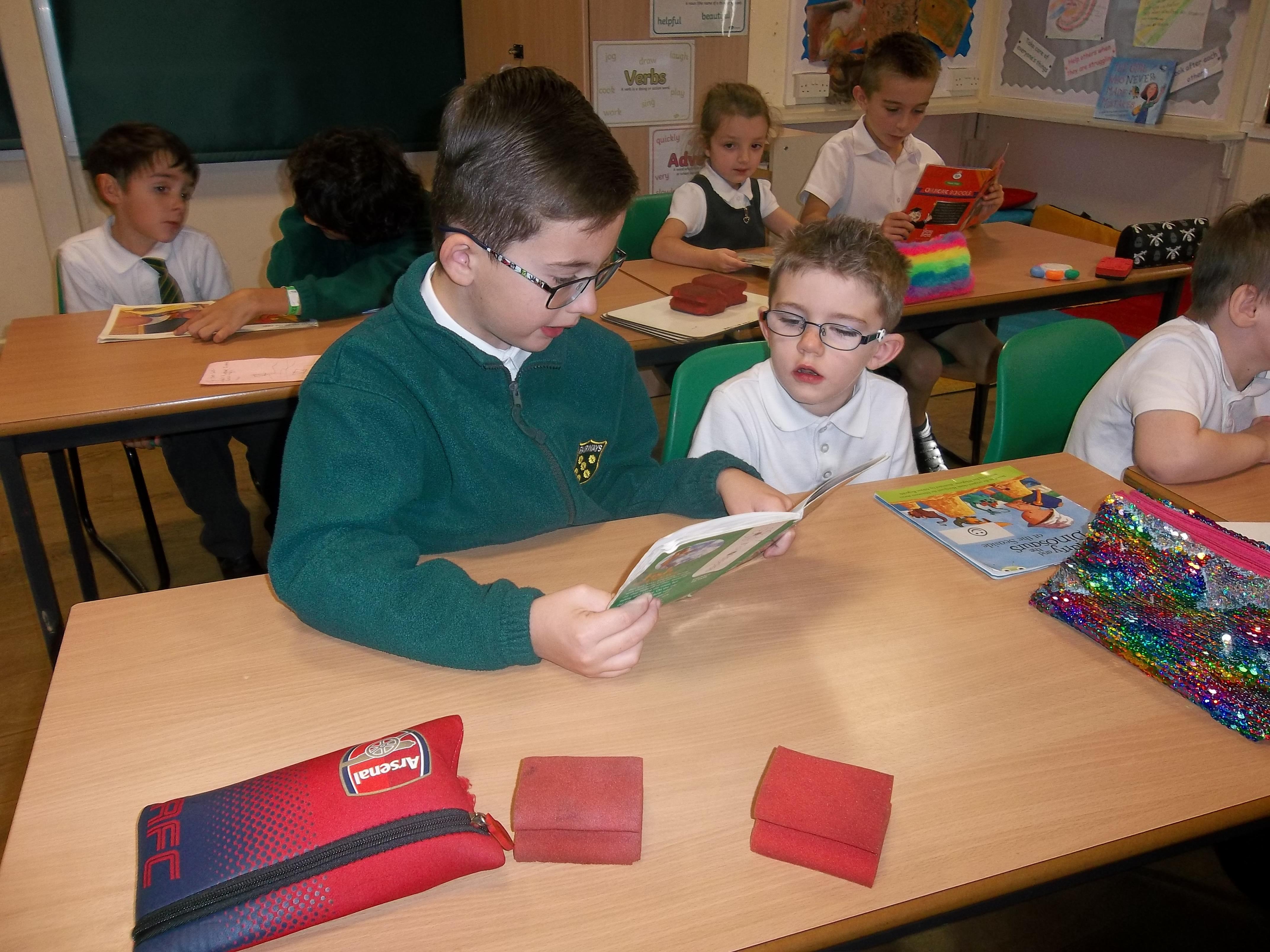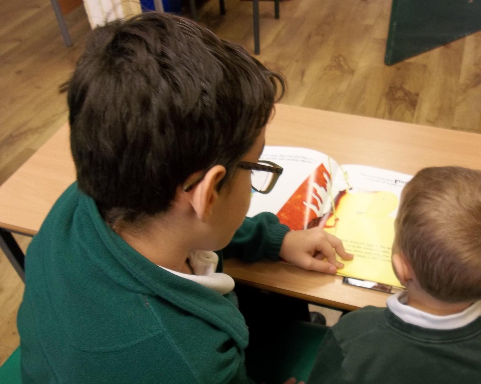 This morning, the whole school took part in a shared reading session. Every child in every class paired up with another child of a different age to share a book. Each child took it in turn to read to their partner.