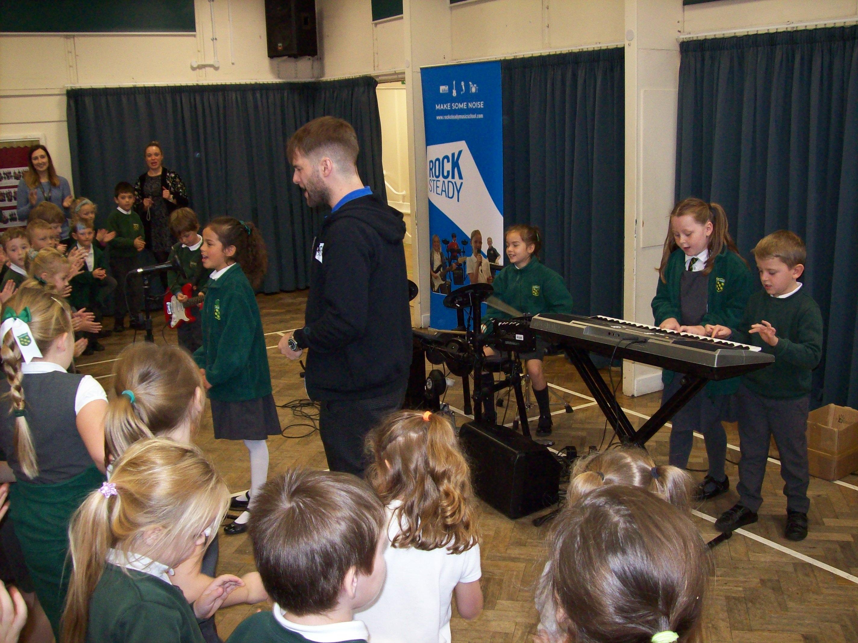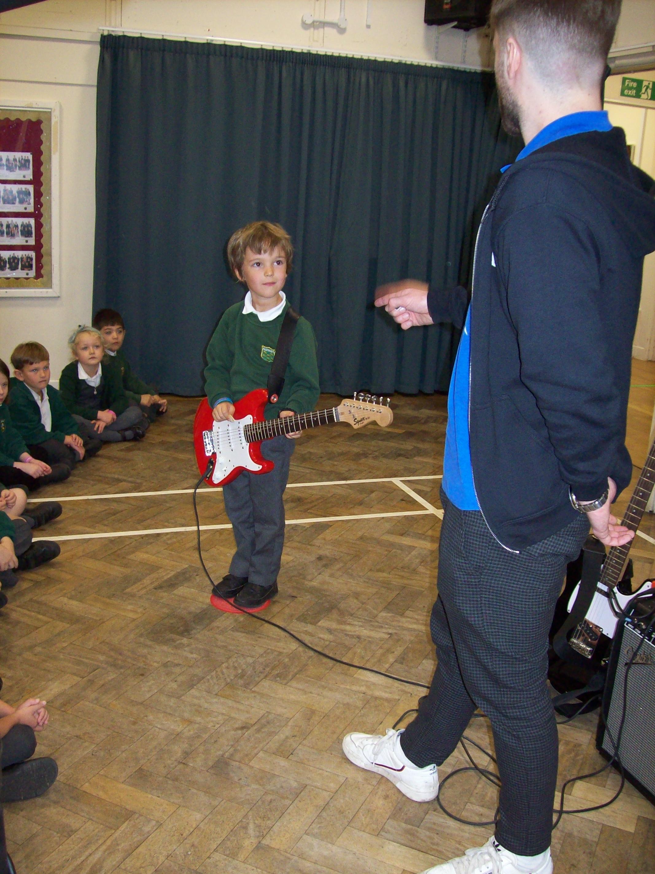 Tim, from Rocksteady Music School, visited to work with the children and demonstrate some of the instruments used in a rock band.