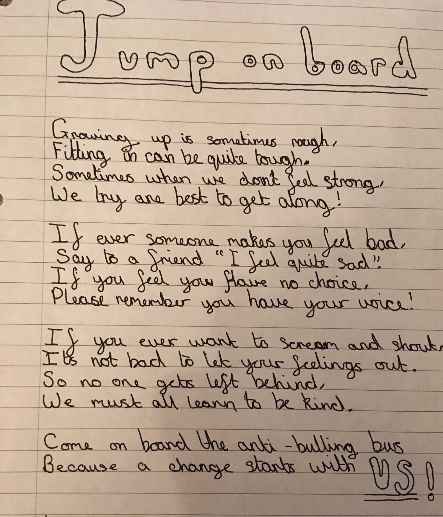 It was so difficult to choose an overall winner. Neve's poem 'Jump on Board' was eventually chosen because of its catchy and important message. Well done everyone and, as Neve said, "Let's all jump on board the anti-bullying bus, because a change starts with US!"