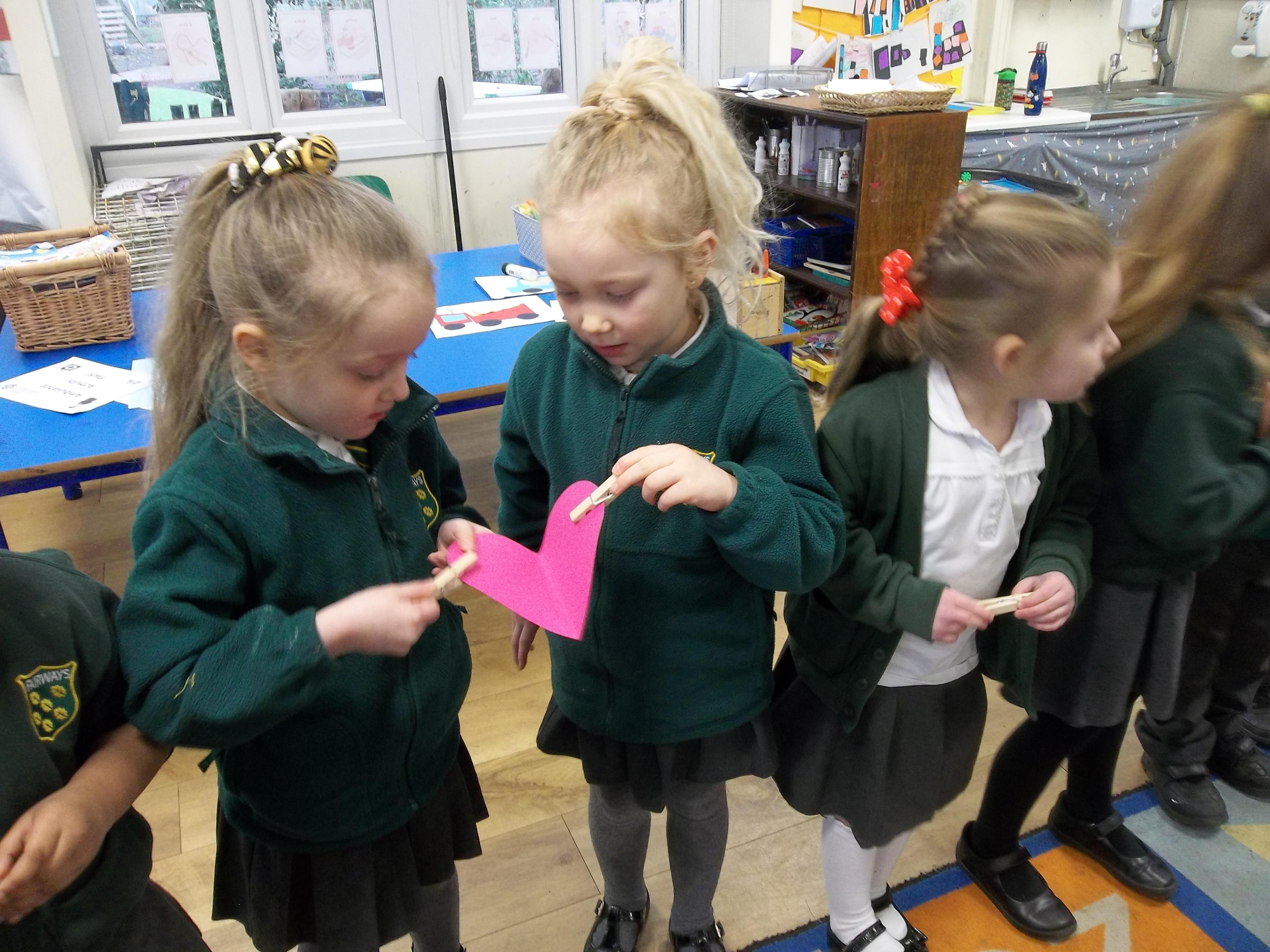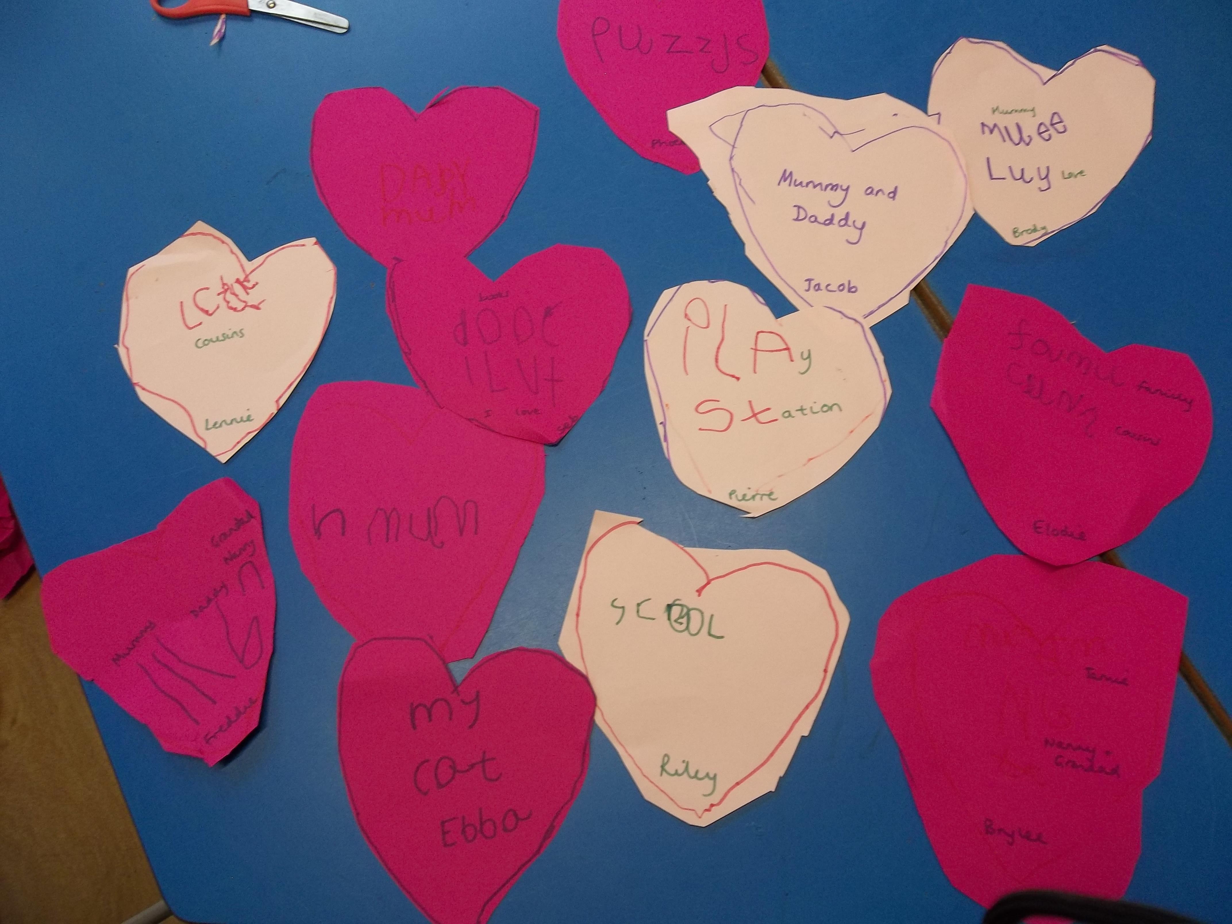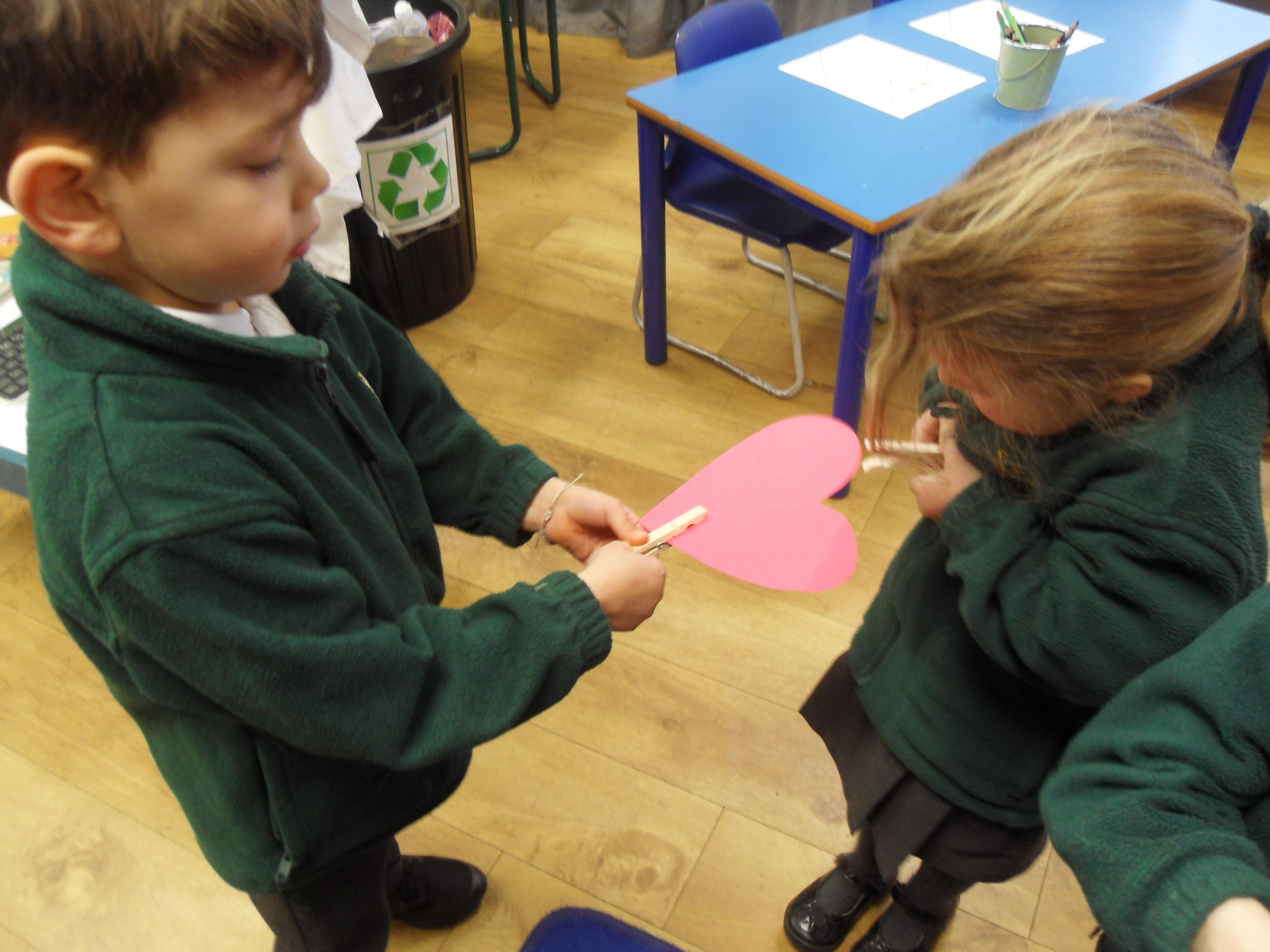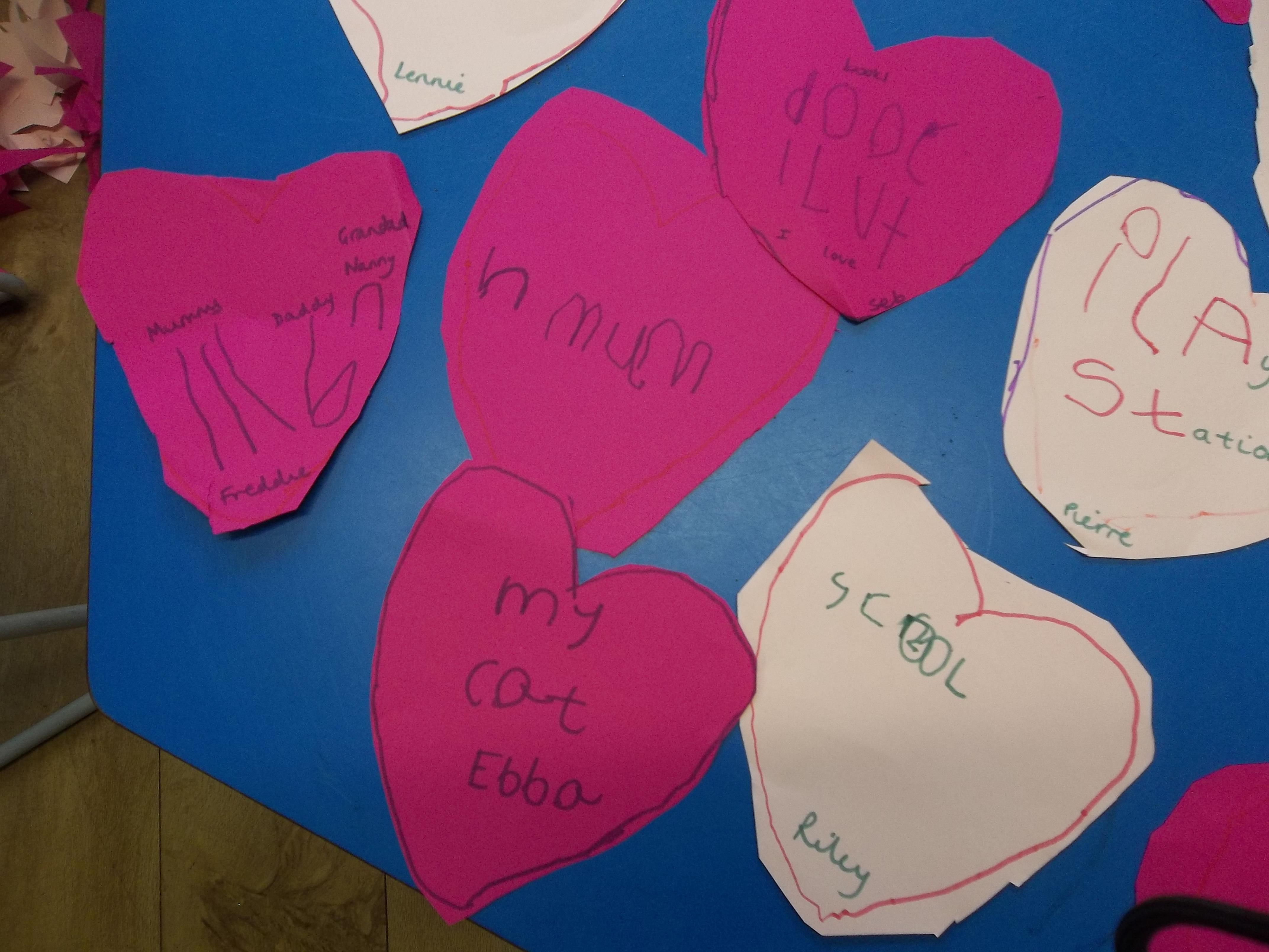 We have been feeling the love in Reception today. Children played a team building game which worked on their communication as well as their fine motor skills. The children were asked to pass a cardboard heart around the circle just using a peg! The first few times were a bit tricky but the children soon realised they had to work together to ensure the heart didn't fall! We have also written down what we love and matched the number of hearts to the correct number!