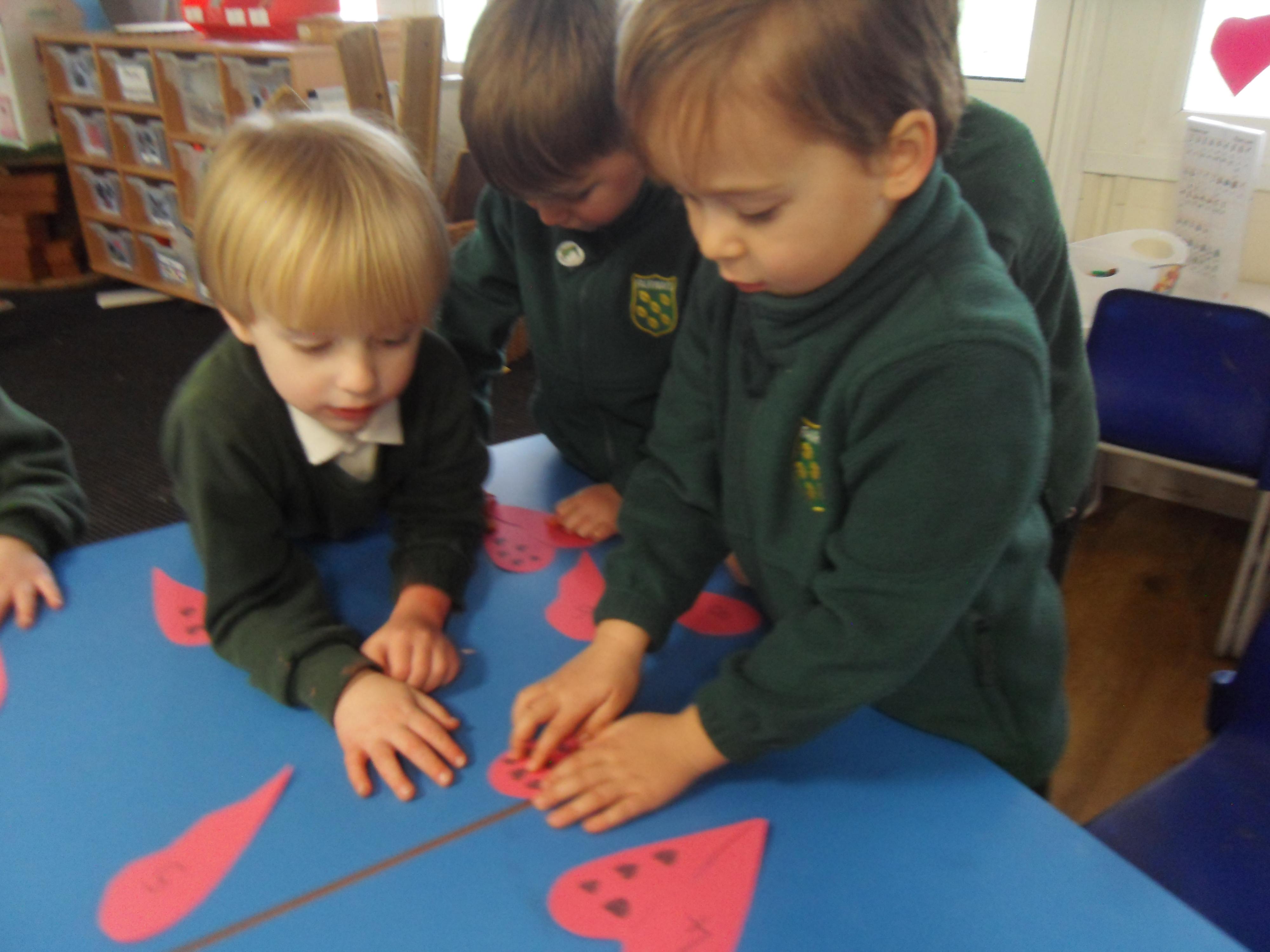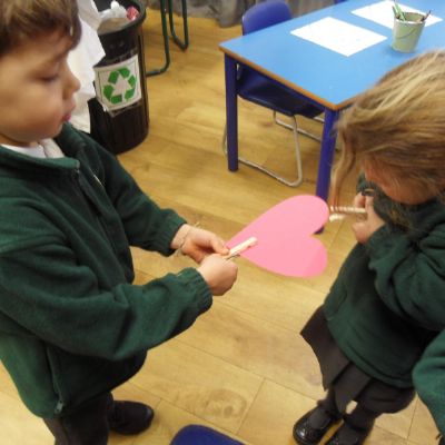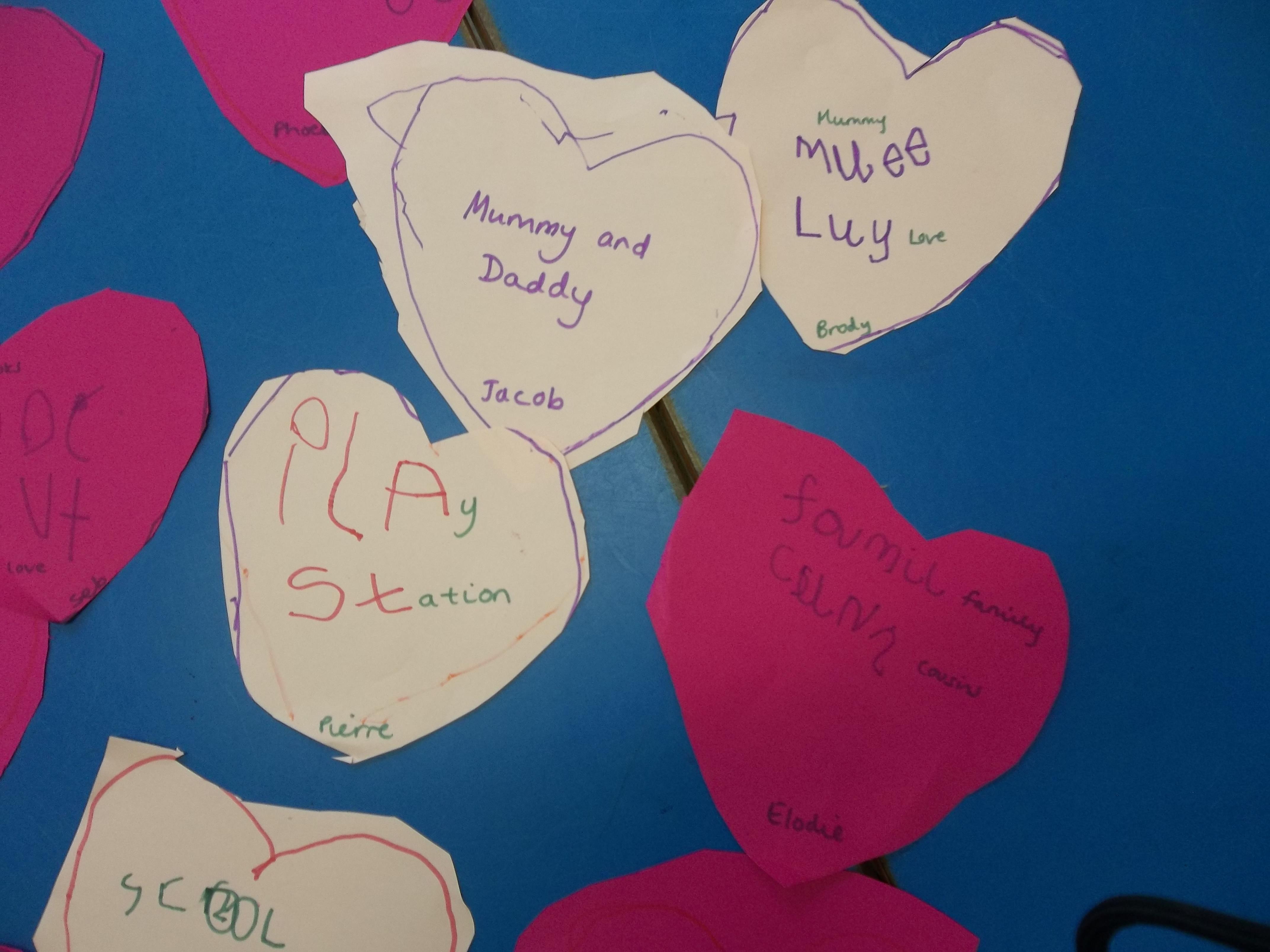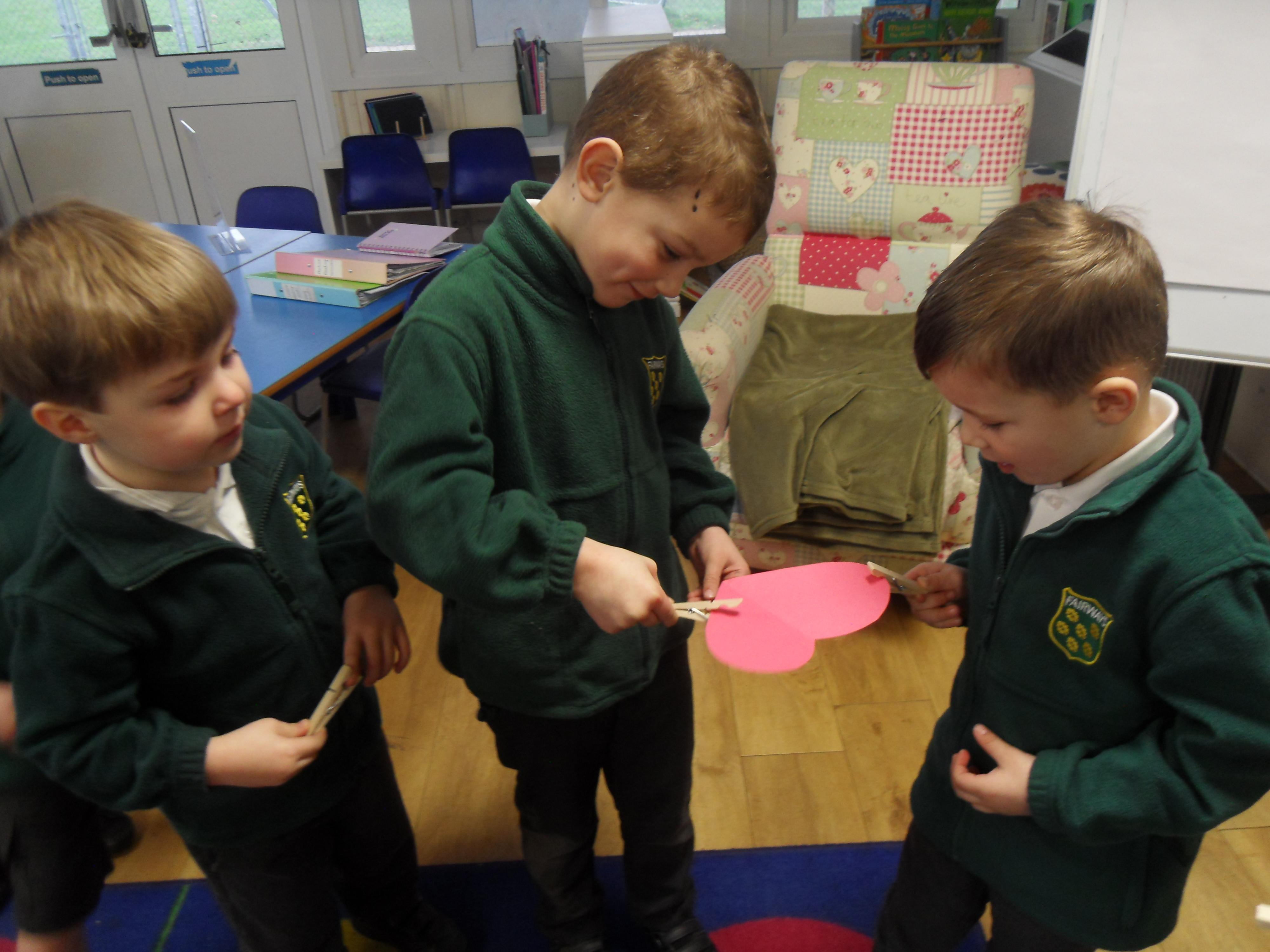 We have been feeling the love in Reception today. Children played a team building game which worked on their communication as well as their fine motor skills. The children were asked to pass a cardboard heart around the circle just using a peg! The first few times were a bit tricky but the children soon realised they had to work together to ensure the heart didn't fall! We have also written down what we love and matched the number of hearts to the correct number!
