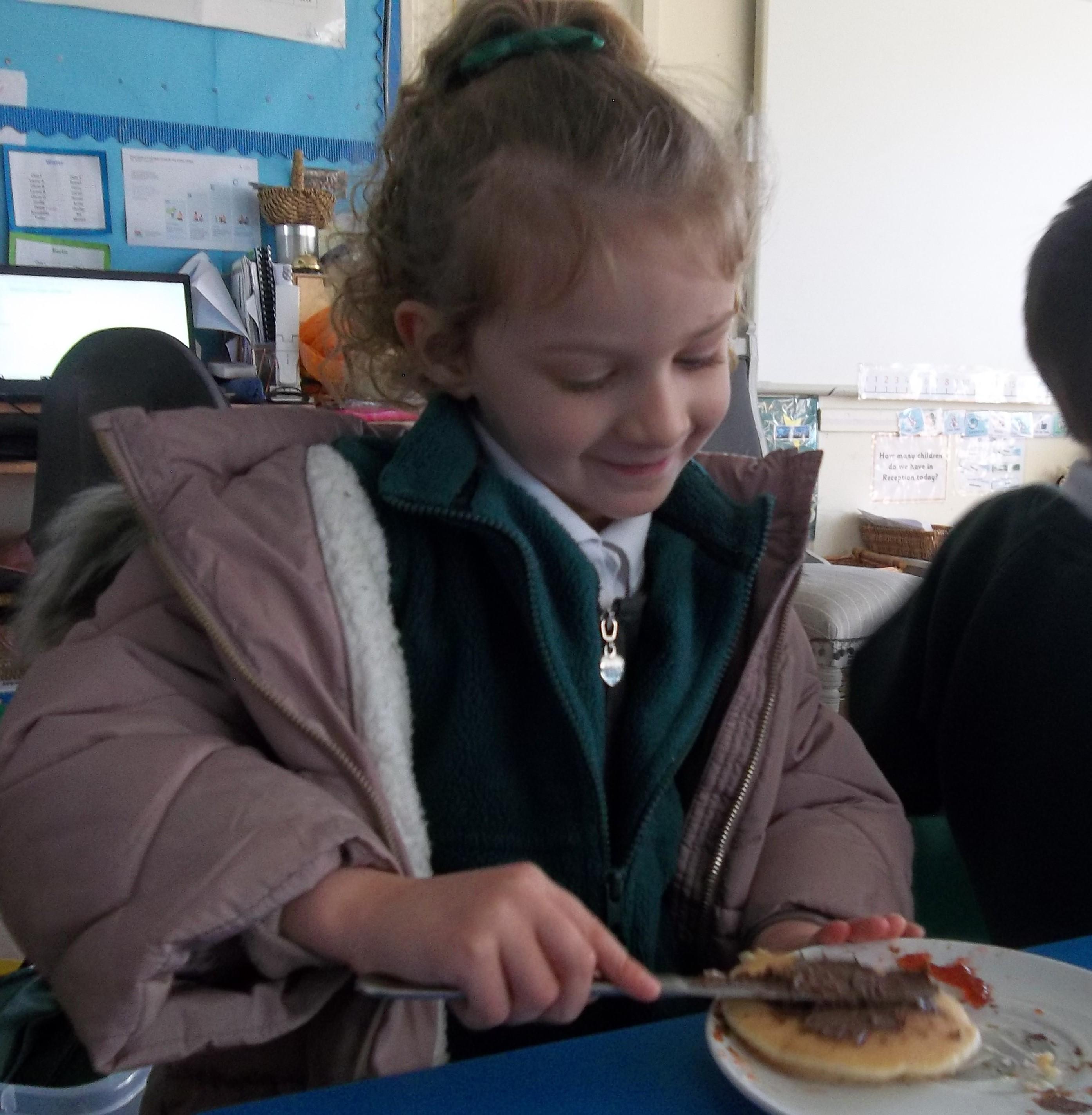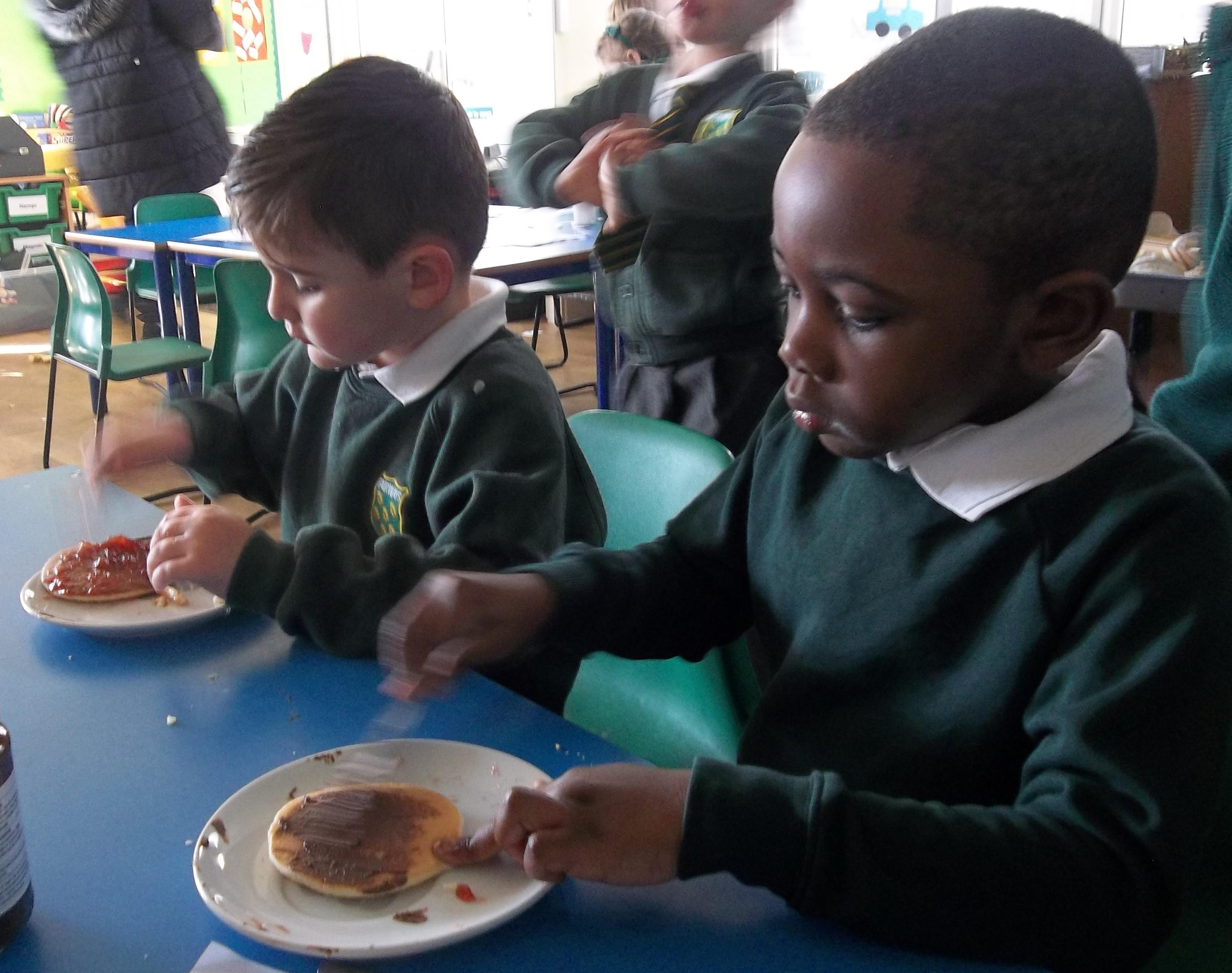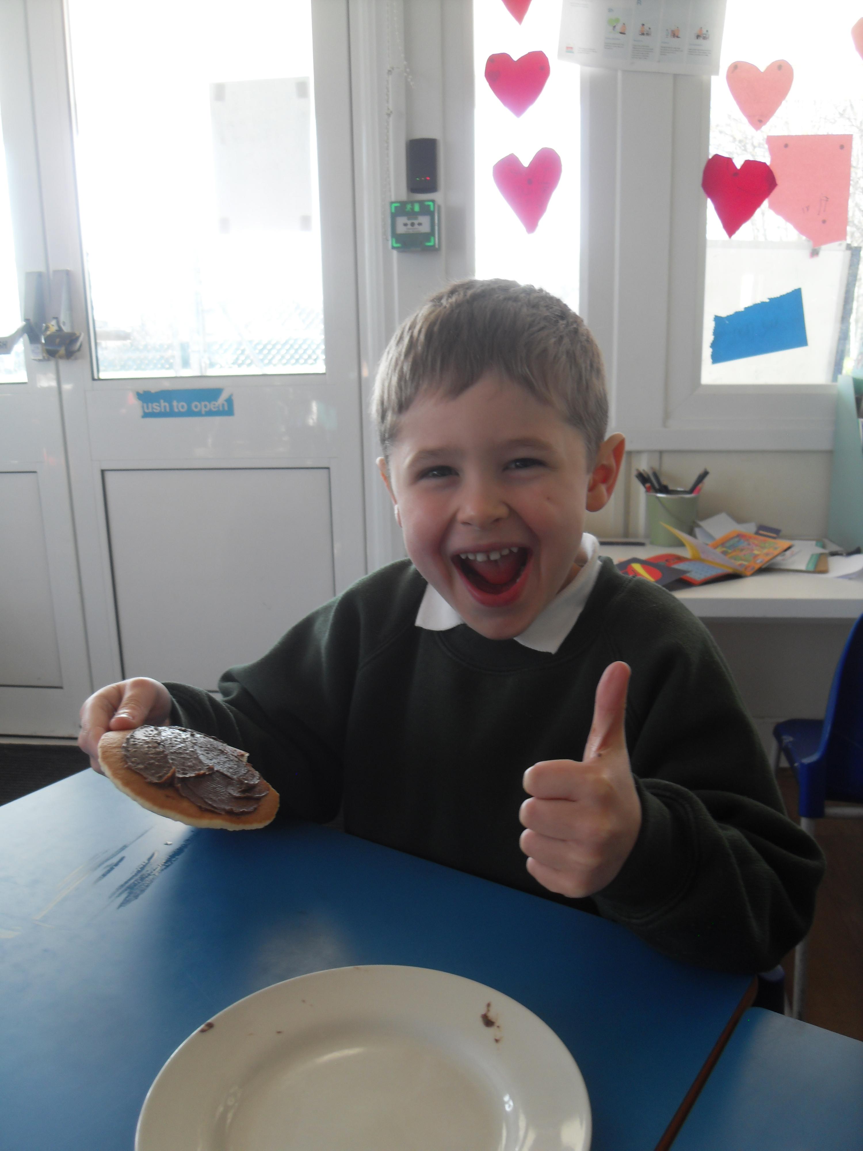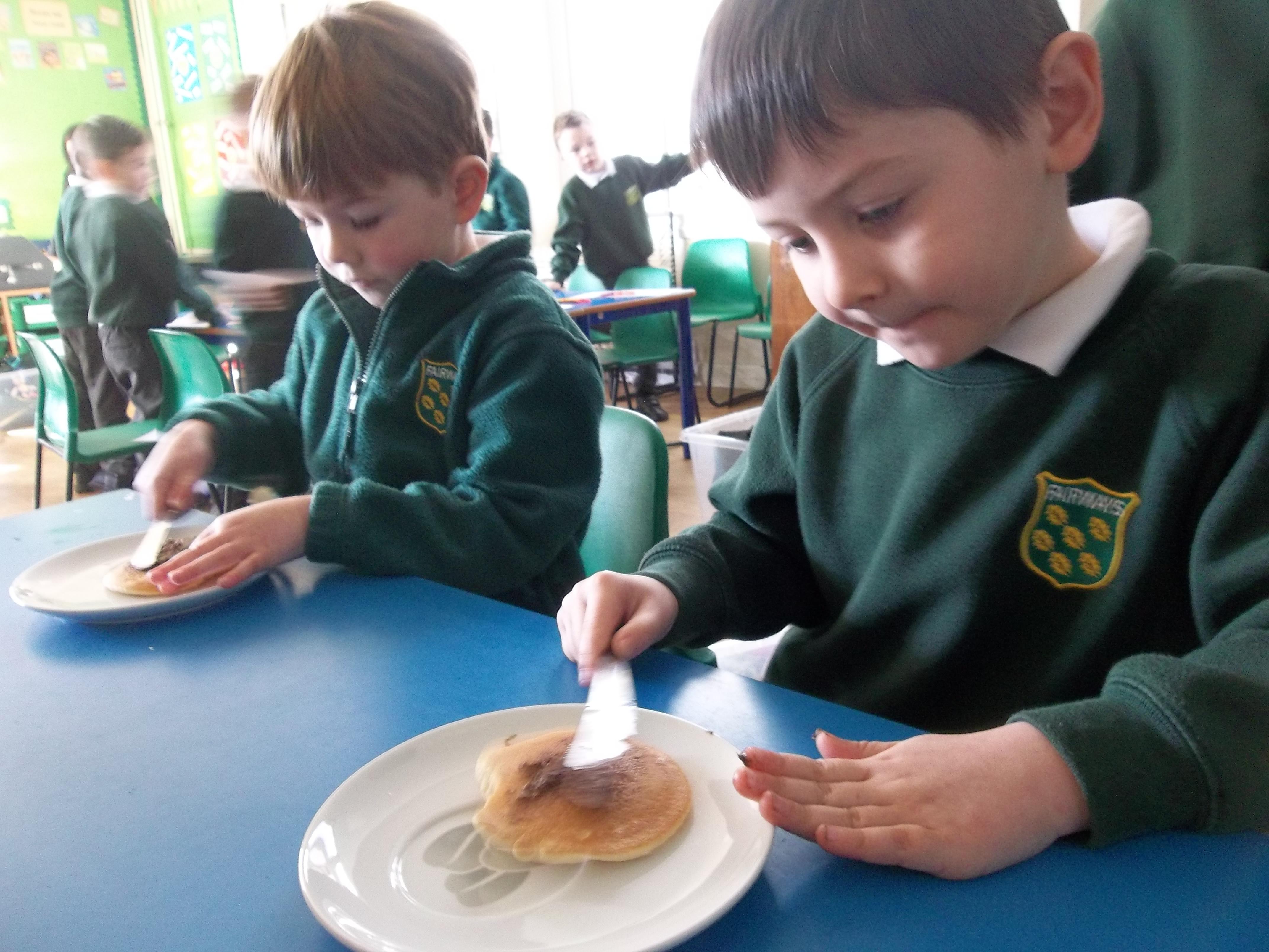 Today we have been learning about the traditions associated with Shrove Tuesday and how it is celebrated in different countries. The children were very excited to discover that we would actually be eating pancakes in school! They chose between jam and chocolate as a topping and had to demonstrate good control of the knife to spread their chosen topping onto their pancake before eating it- I think it's safe to say we have a year group full of pancake lovers!