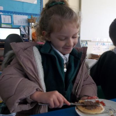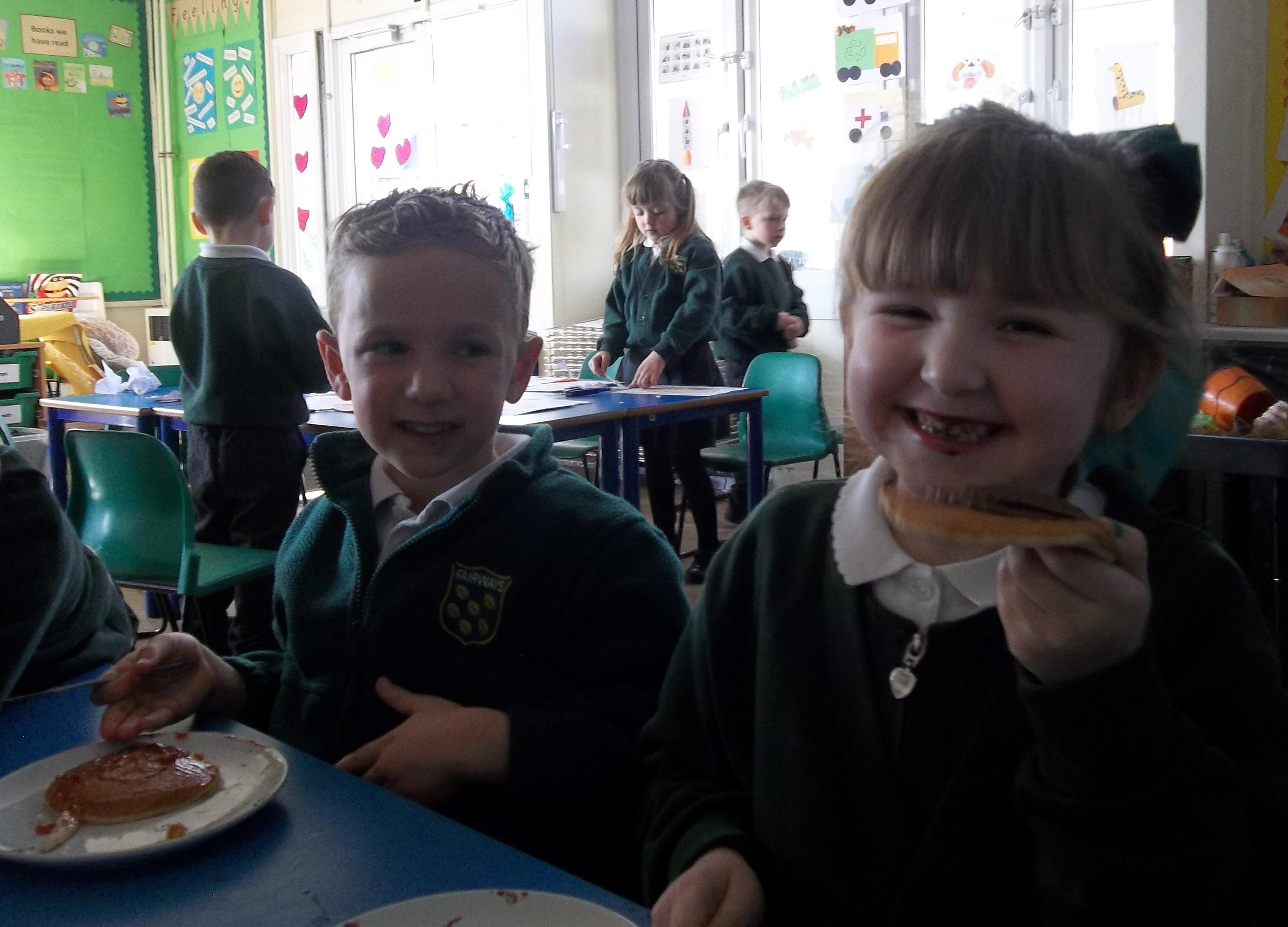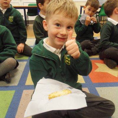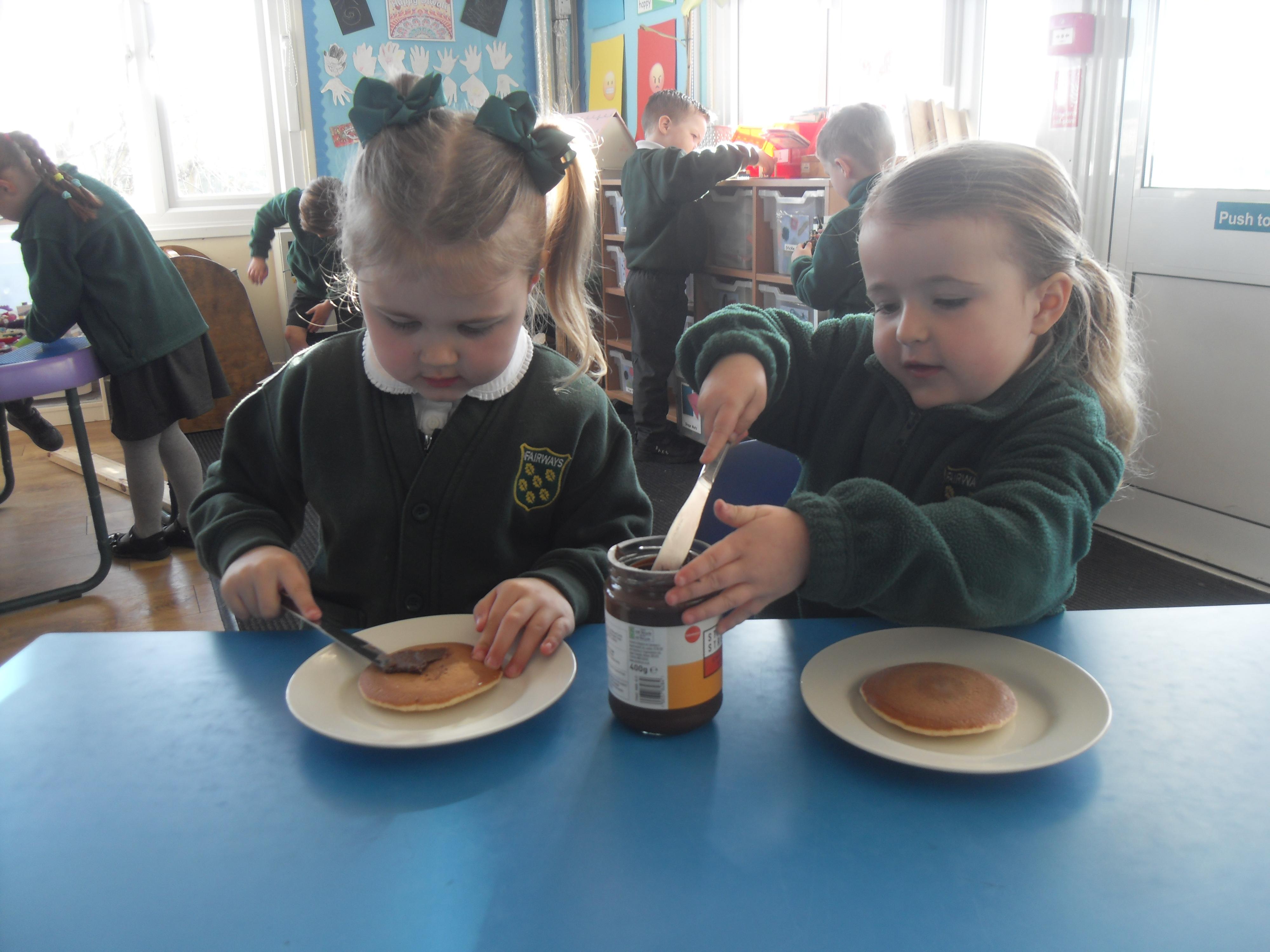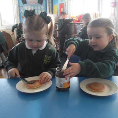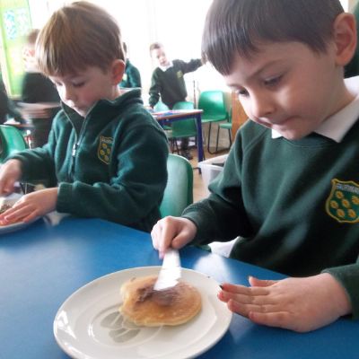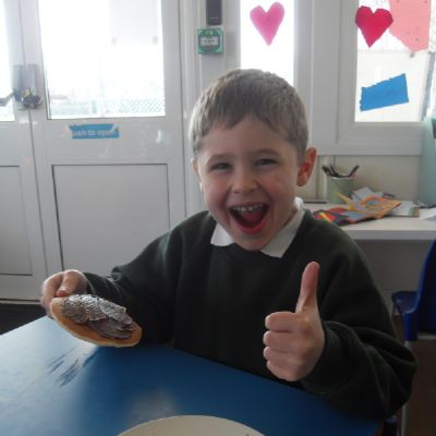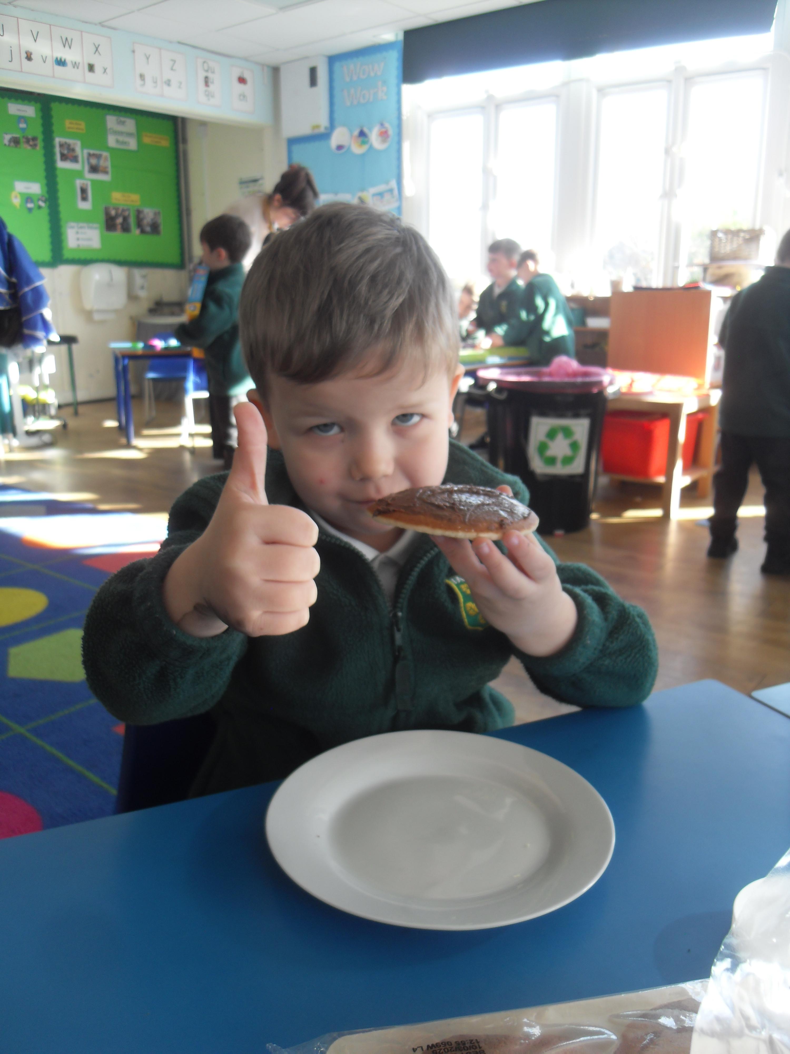 Today we have been learning about the traditions associated with Shrove Tuesday and how it is celebrated in different countries. The children were very excited to discover that we would actually be eating pancakes in school! They chose between jam and chocolate as a topping and had to demonstrate good control of the knife to spread their chosen topping onto their pancake before eating it- I think it's safe to say we have a year group full of pancake lovers!