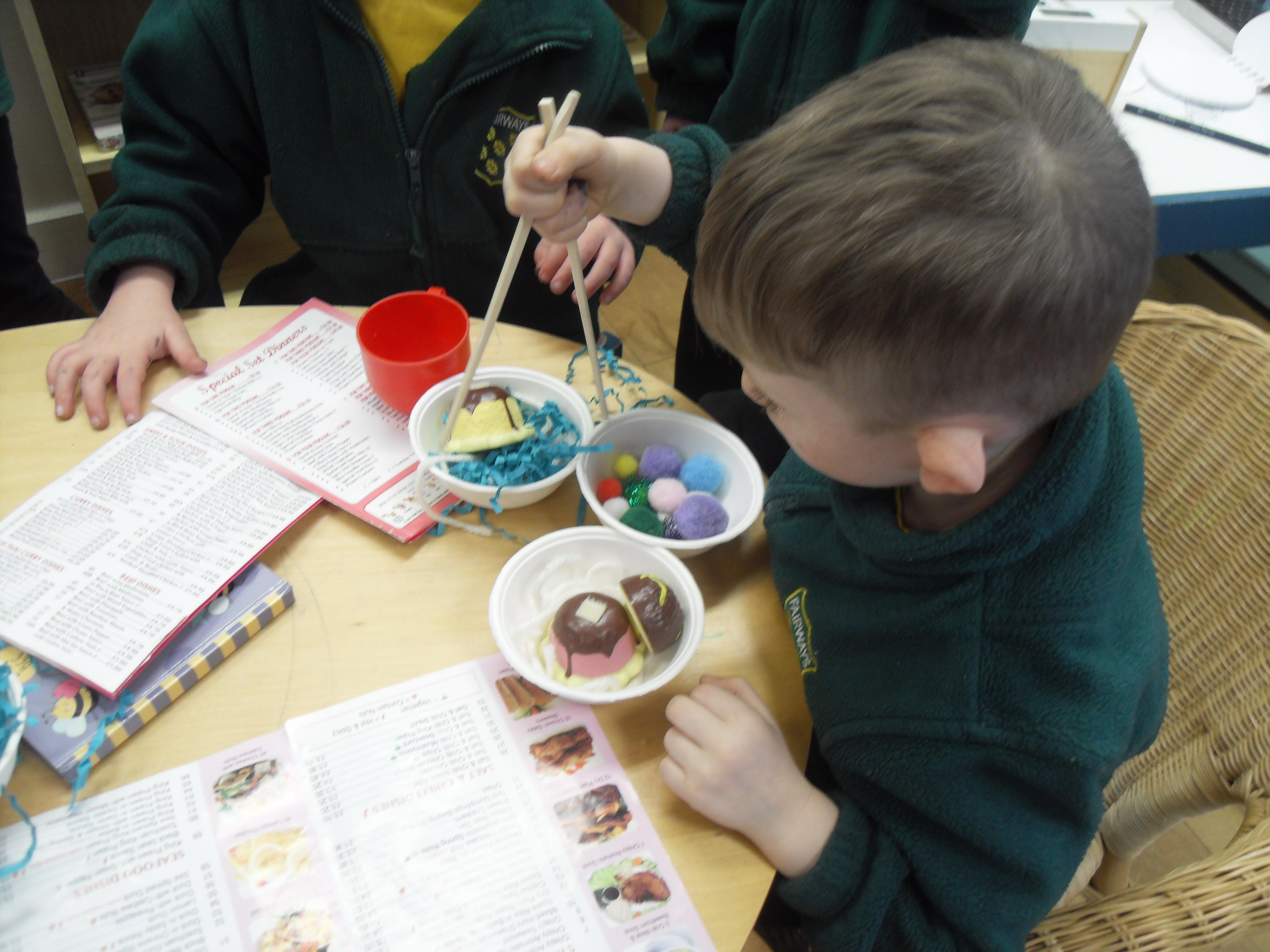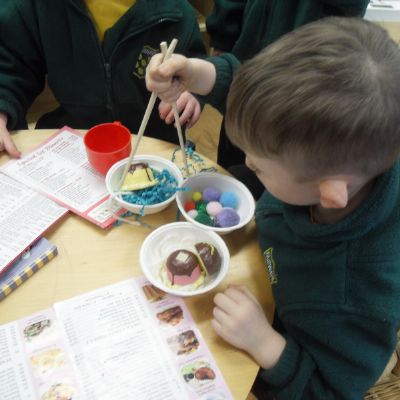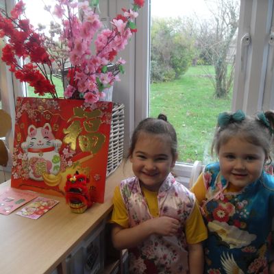 Today we have been celebrating Lunar New Year. The children dressed up, used chopsticks and practised Chinese writing. This year is the year of the snake so we also  cut out some spiral snakes. The children looked at the animal for the year they were born and discovered that they were either a pig if they were born in 2019 or a rat if they were born in 2020.