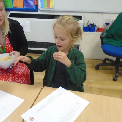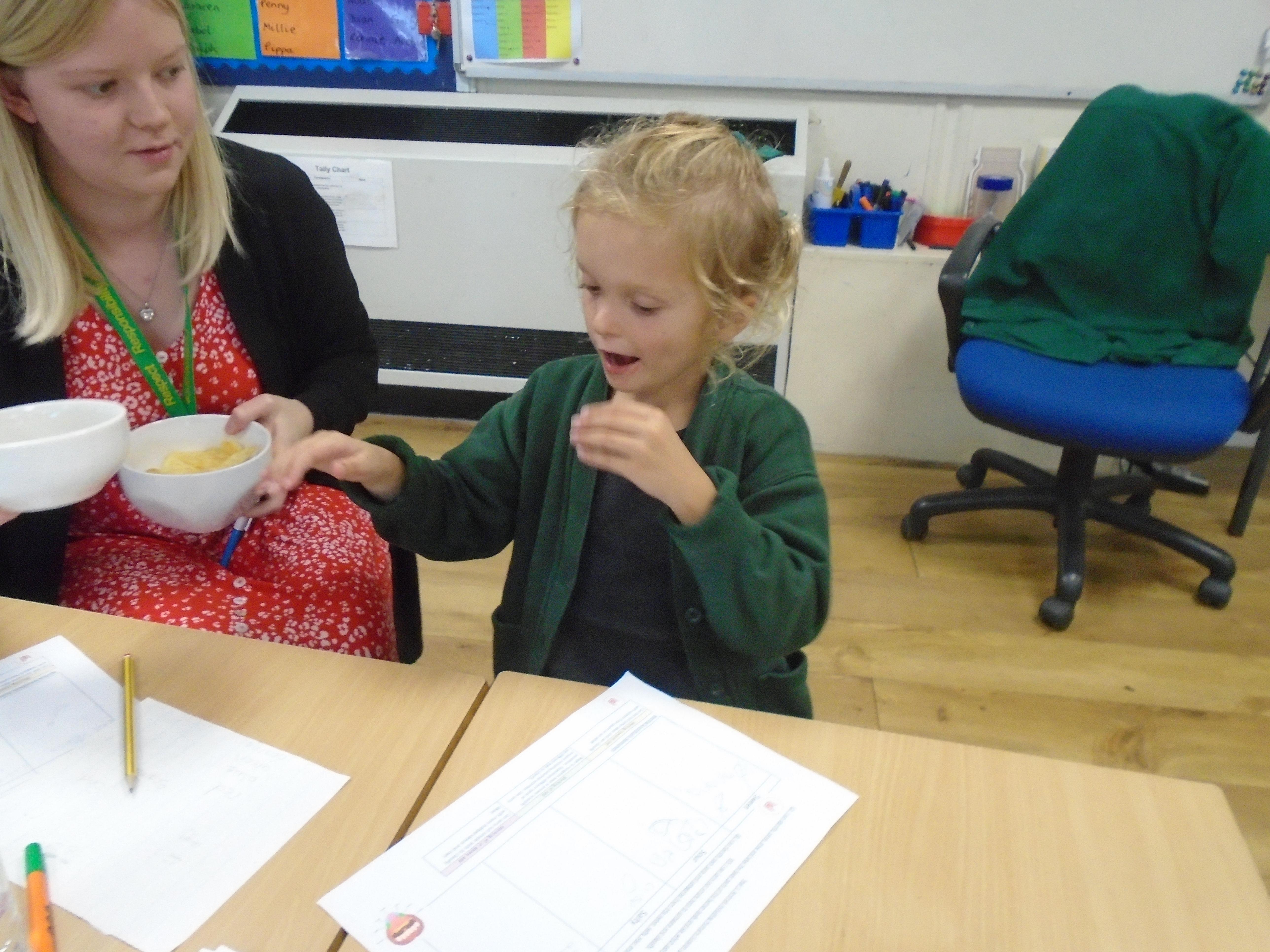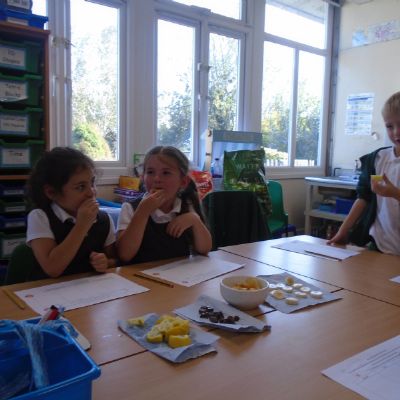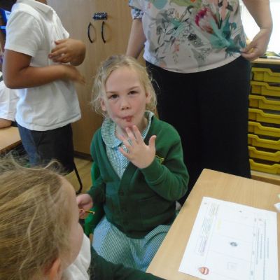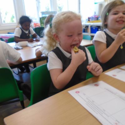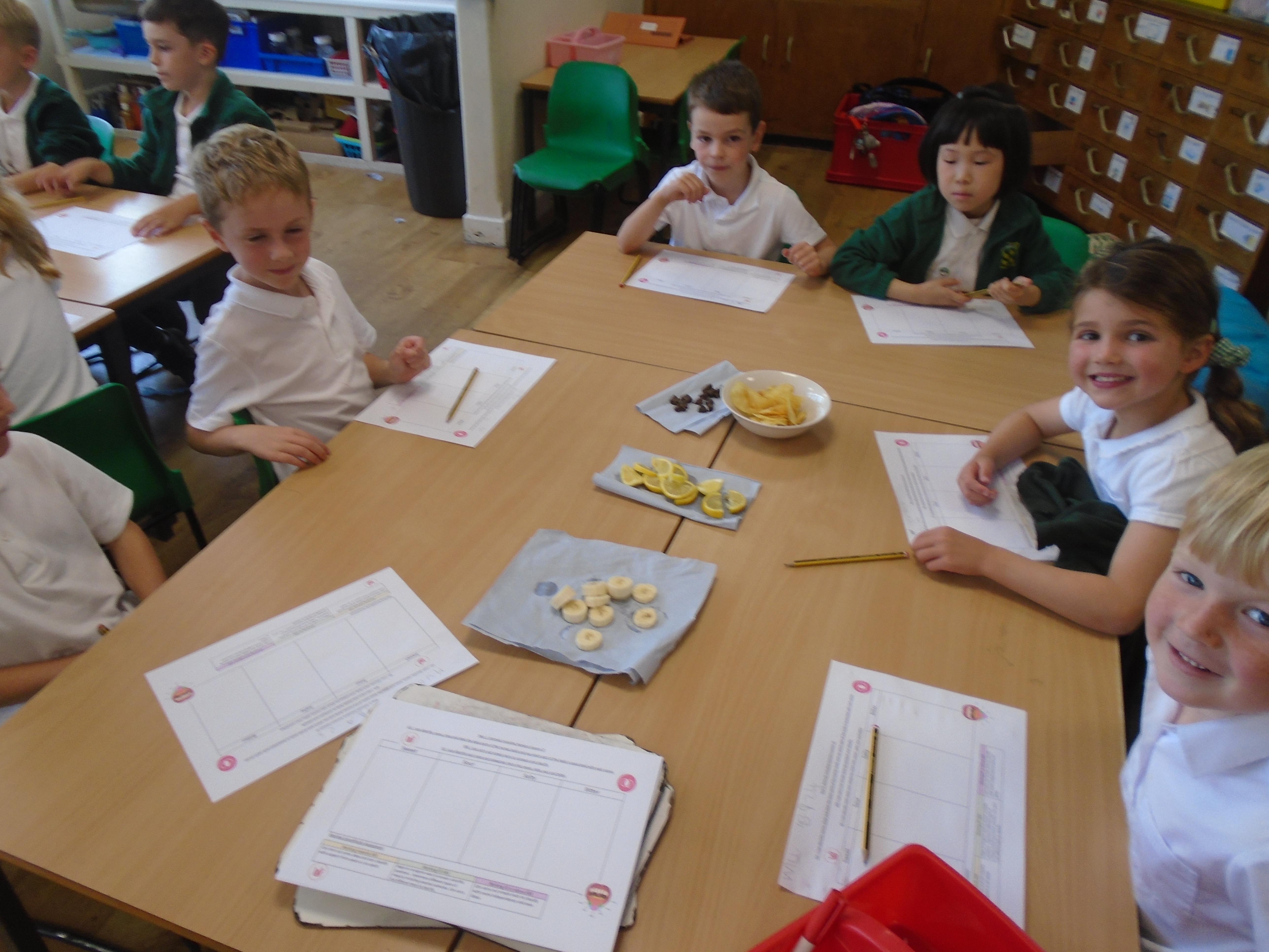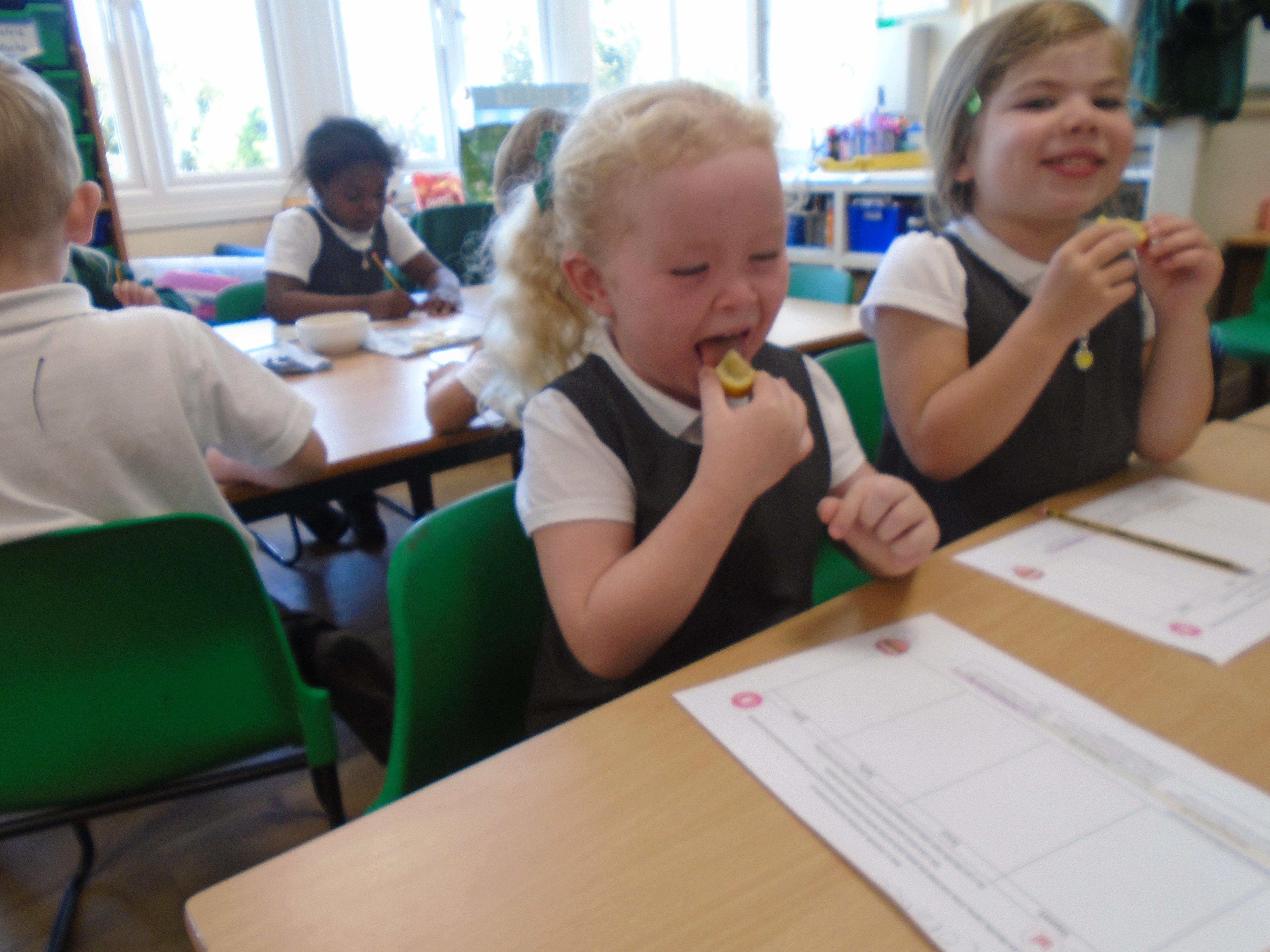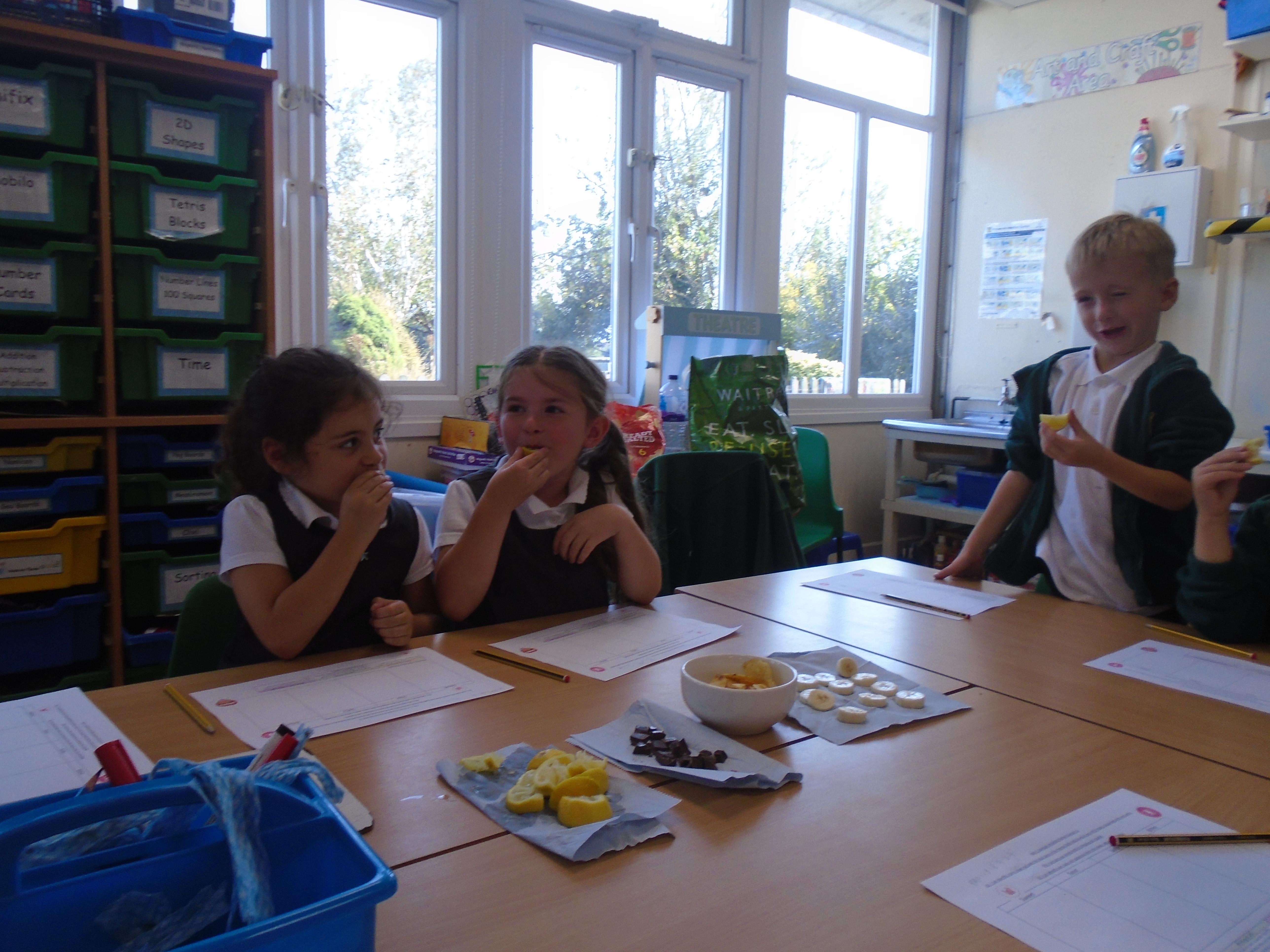 This week in Science we have been learning about our senses. We explored our sense of taste by testing different types of food and discussing which flavour categories they might fit into. We tasted sour lemon, sweet banana, salty crisps and dark chocolate (bitter). We learnt how the taste buds on our tongues help us detect which flavours food might be and how it felt to eat these different foods.